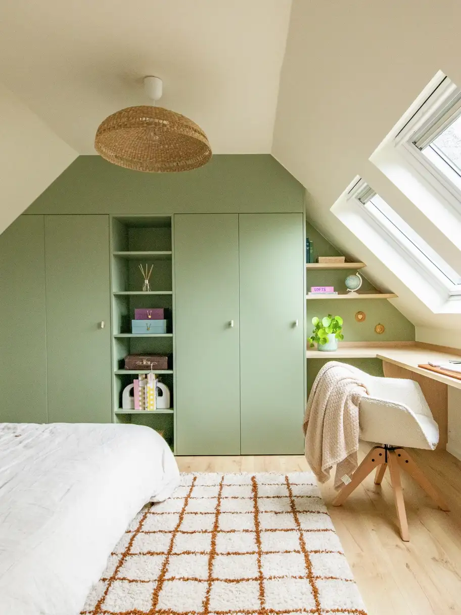 To brighten your loft and make the most of natural light, install VELUX roof windows and lean into soft, airy tones — think chalky white, muted sage, blush pink or pale grey and natural wood tones. These colours help your furniture blend seamlessly into your loft space while reflecting light across the room. Add mirrors or polished surfaces to amplify brightness and create a sense of openness.
