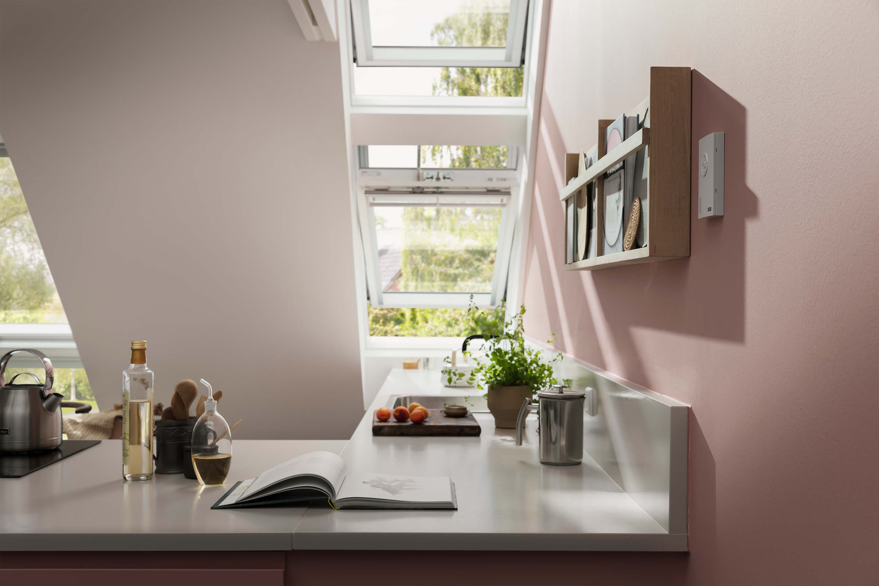 VELUX electric or solar-powered roof windows are a great option for the kitchen. With their pre-paired wall switch, you can open and close them with the touch of a button. When considering internal finish, go for moisture-resistant and maintenance free white polyurethane roof windows. Go for Venetian blinds - perfect for humid rooms. And yes, they are easy to clean.