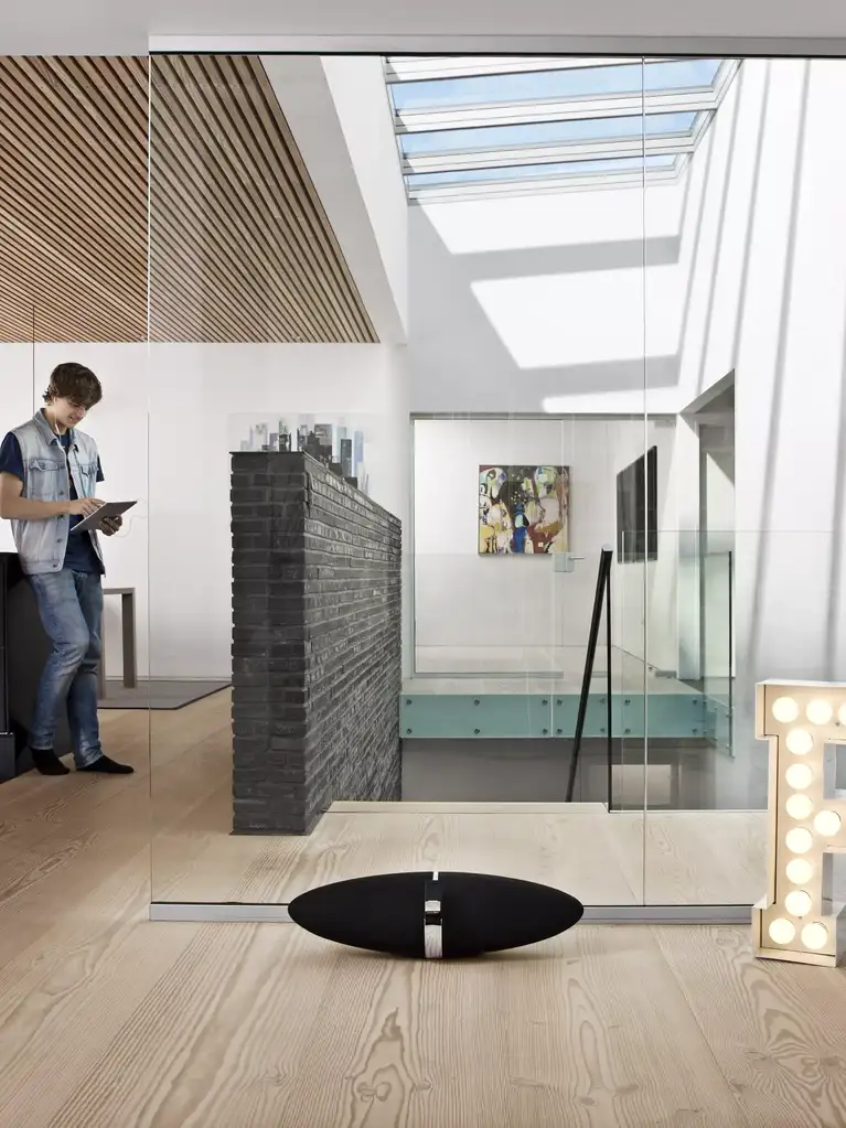 Optional roller blinds are supported by thin wires to create an invisible effect. Blinds are available in three neutral colours that match any interior.