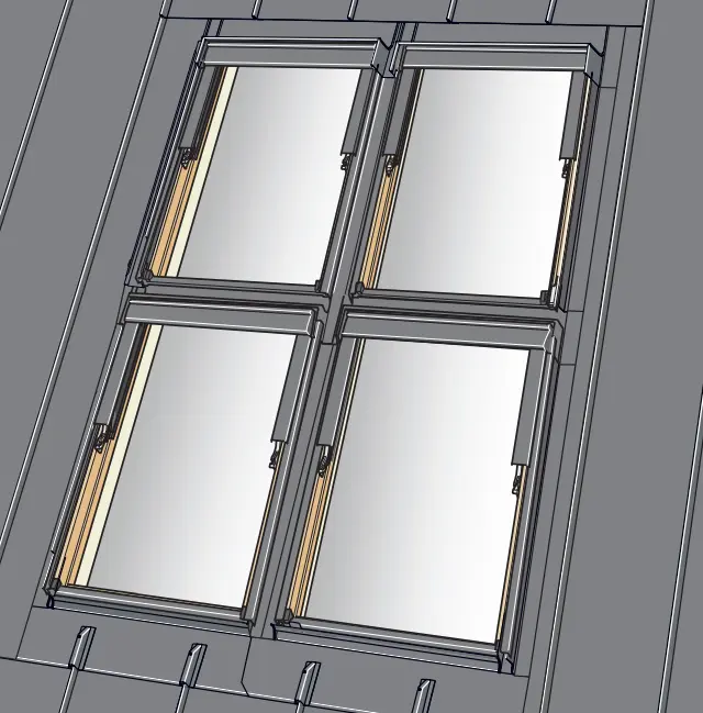 Flashing EKQ is for installing roof windows in combination. The system has seven elements that enable every combination. The VELUX Pro+ flashing set (EKQ 2001M) includes the BFX underfelt collar, BDX insulation collar and a middle gutter that adjusts between 100 -160 mm.